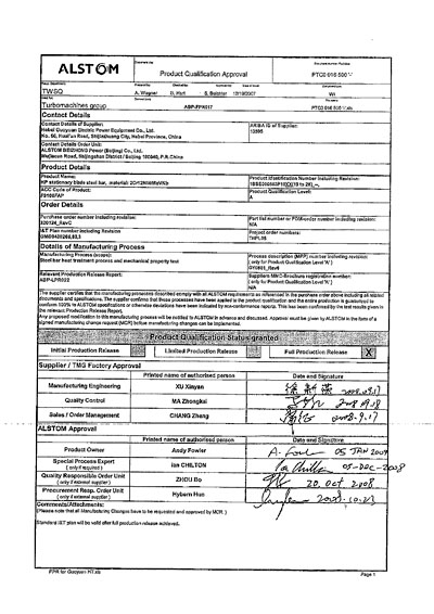2008年我公司為ALSTOM提供的葉片通過了FPR(完全放行文件)、并且成為國內唯一一家ALSTOM授予FPR的產品供應商。