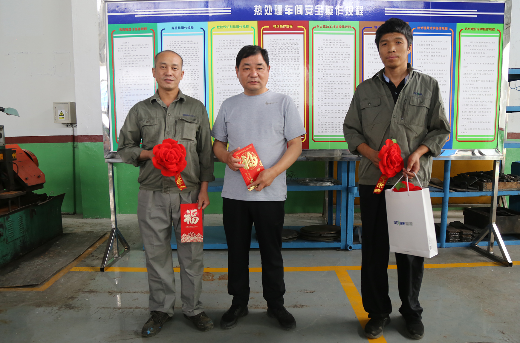 董事長劉運智先生為熱處理車間榮獲首創(chuàng)生產(chǎn)現(xiàn)場“標(biāo)桿車間”稱號、機加車間北區(qū)榮獲首創(chuàng)生產(chǎn)現(xiàn)場“達標(biāo)區(qū)域”榮譽稱號,頒發(fā)了榮譽牌匾;生產(chǎn)運營中心副總經(jīng)理趙紹璞同志陪同董事長為現(xiàn)場標(biāo)桿員工發(fā)放獎金、并佩戴光榮花。